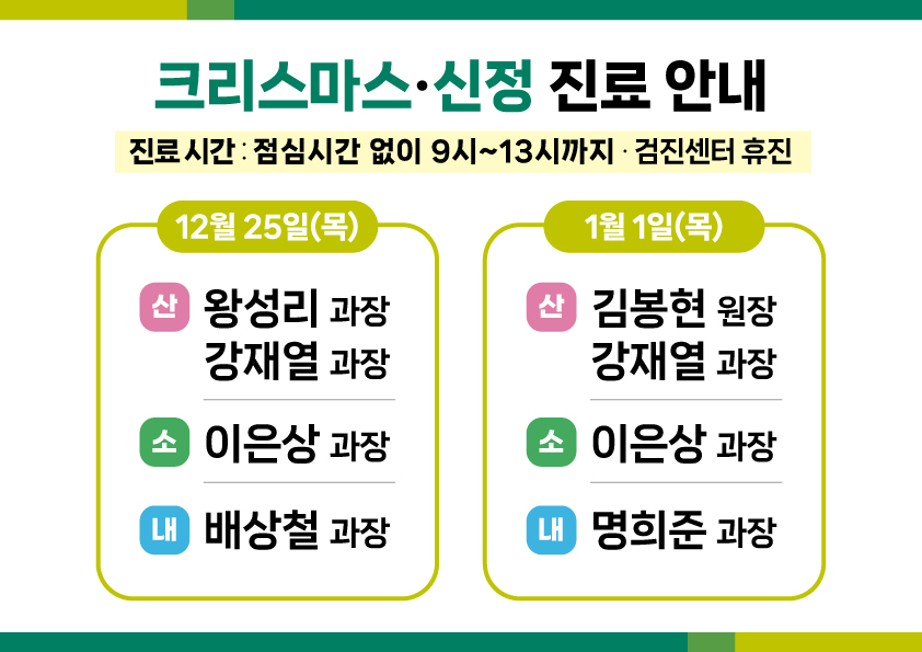 12/25(목 · 크리스마스), 2026년 1/1(목 · 신정) 진료 안내 드립니다.