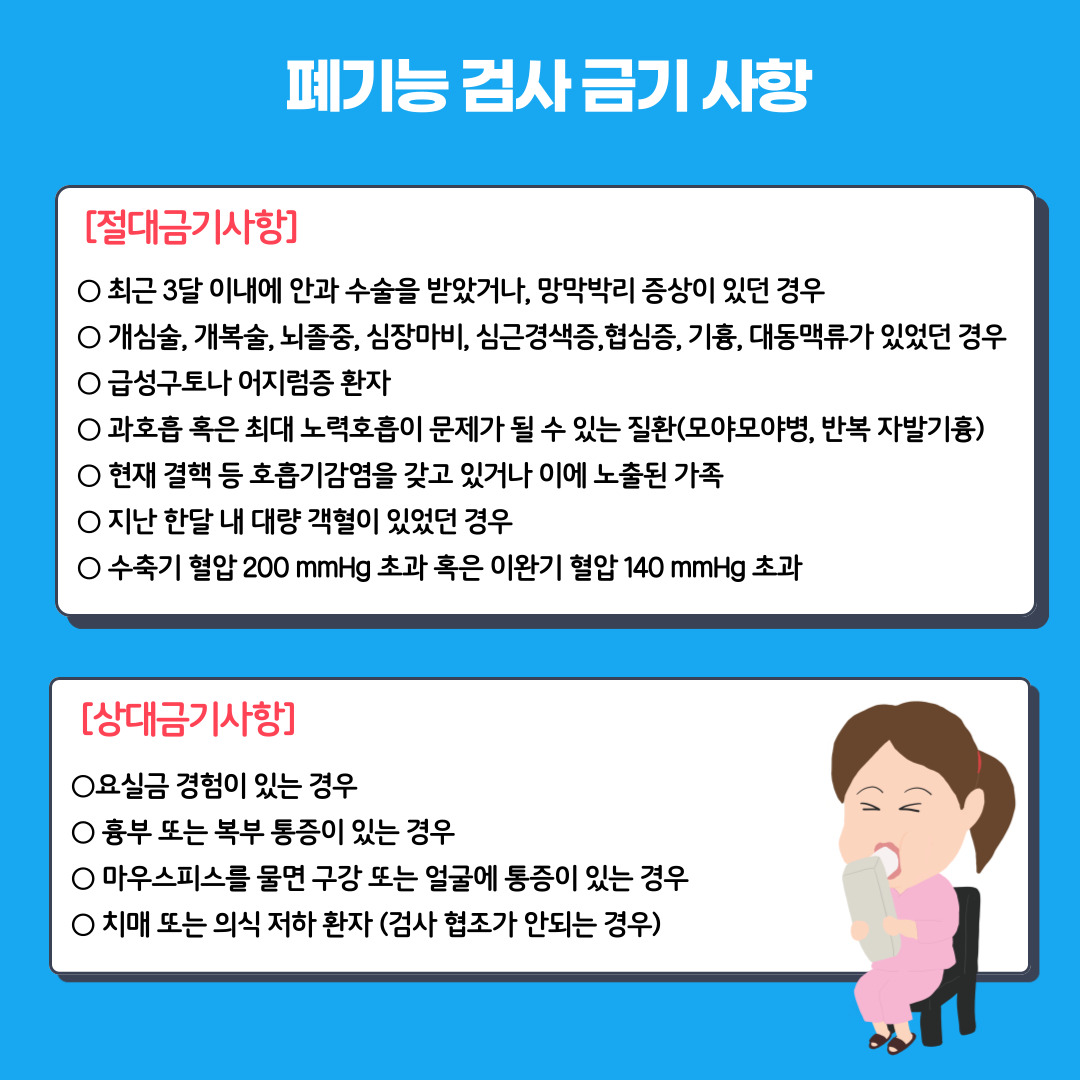 폐기능 검사란 폐활량계(spirometer)로 기도의 폐쇄여부와 정도, 폐용적 등을 측정하는 것으로,