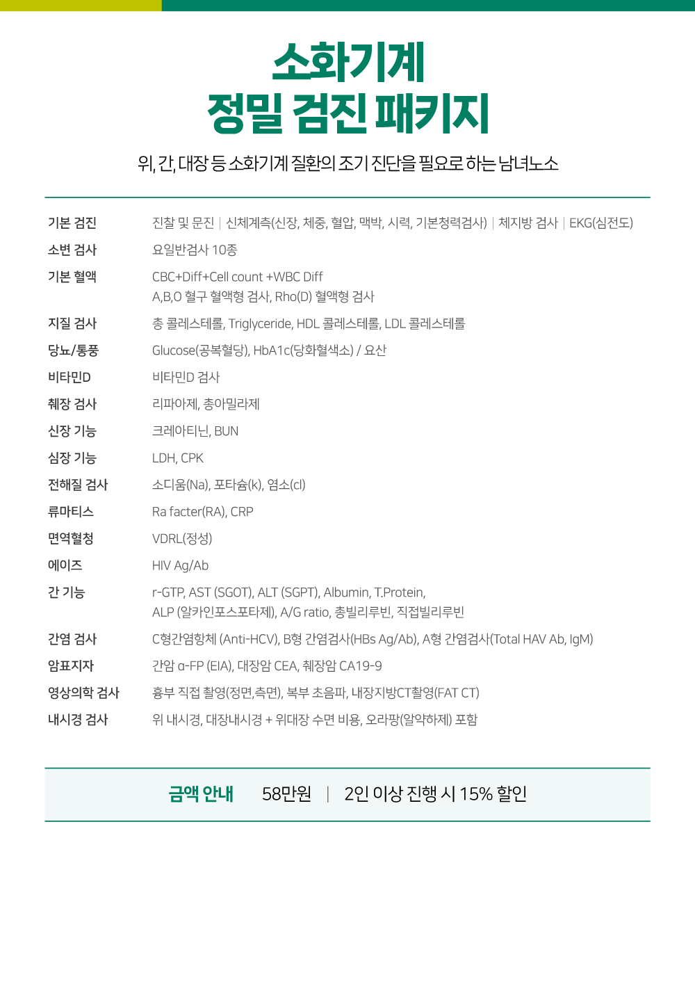 | 소화기계 정밀 검진 패키지 | 위, 간, 대장 등 소화기계 질환의 조기 진단을 필요로 하는 남녀노소 | JPG 파일 |