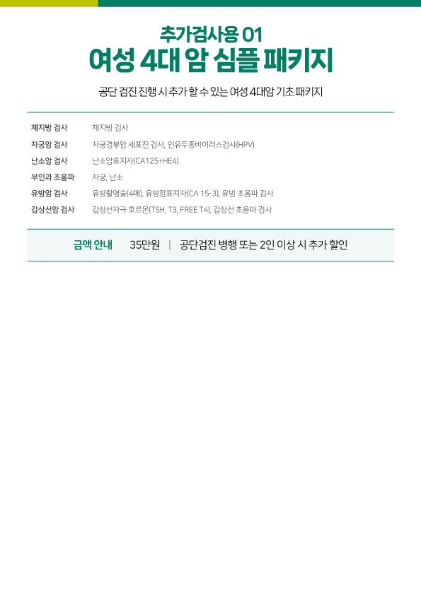| 여성4대암 심플 추가 패키지 | 30대 이상의 여성분들께 추천하는 자궁, 난소, 유방, 갑상선 등 4대 여성암 패키지 |